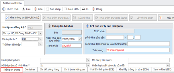 Nhập thông tin về loại hình khai báo, mã hải quan khai báo;