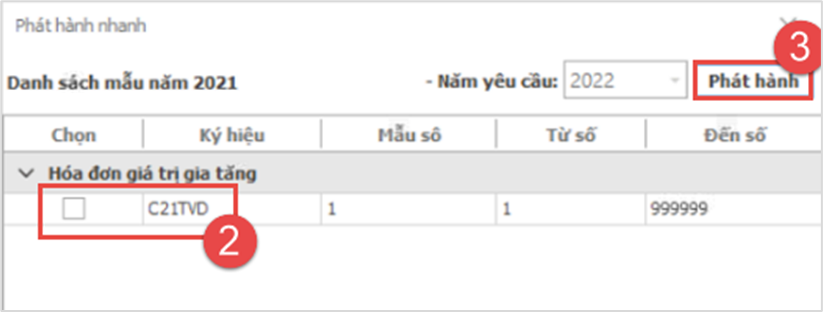 - Sau khi cập nhật phần mềm iXHD phiên bản mới nhất, Anh/Chị sẽ nhận được một thông báo “Bạn có muốn phát hành mẫu hóa đơn hay không?”, Anh/Chị nhấn “Có” (1) > Lựa chọn ký hiệu hóa đơn muốn tiếp tục phát hành trong nằm 2022 (2) > Nhấn chọn “Phát hành” (3)
