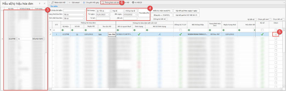 - Trên thanh tiêu đề, chọn “Hóa đơn điện tử” (1) > “Danh sách hóa đơn CQT” (2)> Lựa chọn Mẫu số/Ký hiệu hóa đơn (3) > Nhập “Từ ngày” “Đến ngày”, sau đó nhấn “Tìm kiếm” để tra cứu hóa đơn (4) > Đánh dấu Tick vào ô “Chọn” (5) phía cuối hóa đơn phát hiện sai sót > “Thông báo sai sót” (6)