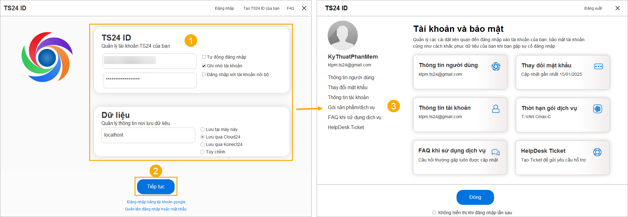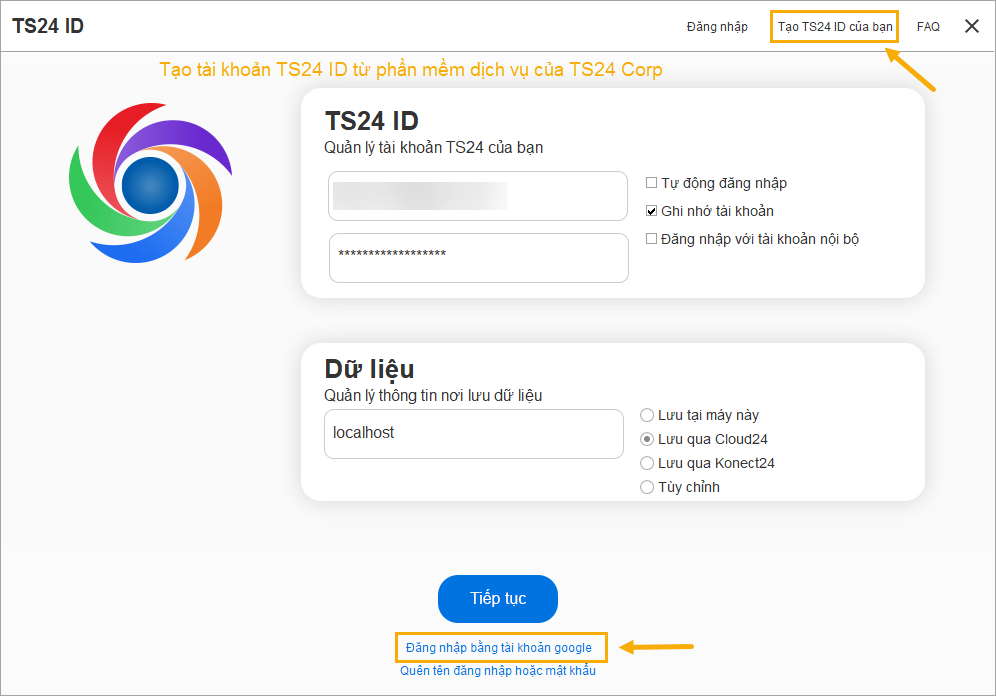 Từ phần mềm dịch vụ của TS24 (TaxOnline, iBHXH, ezBooks, iXHD…): cài đặt, khởi động phần mềm trên máy tính, tại giao diện đăng nhập nhấn chọn Tạo TS24 ID của bạn hoặc Đăng nhập với tài khoản Google (*).