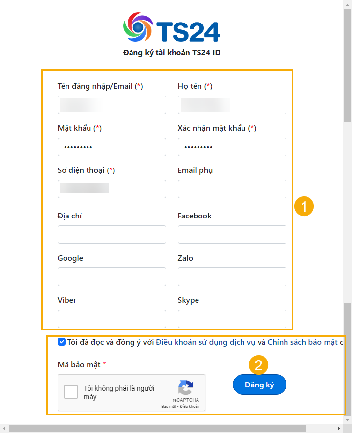 Bước 2: Nhập thông tin bảng Đăng ký tài khoản TS24 ID