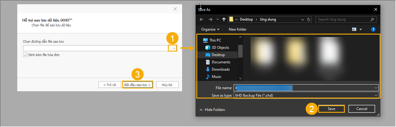 - Xuất hiện bảng sao lưu dữ liệu, nhấn chọn Tiếp tục. Thực hiện theo hướng dẫn để lưu về máy tính 1 file backup XHD.Tại giao diện Hỗ trợ sao lưu dữ liệu iXHD, nhấn chọn dấu … để chọn vị trí lưu file sao lưu trên máy tính;