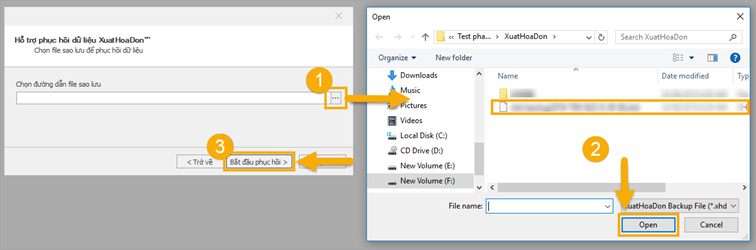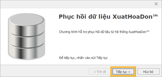 - Xuất hiện bảng phục hồi dữ liệu, nhấn chọn Tiếp tục. Tại giao diện Hỗ trợ phục hồi dữ liệu IXHD, nhấn chọn dấu …, để chỉ đường dẫn mở file backup lưu trong máy tính để thực hiện phục hồi lại dữ liệu trong iXHD;