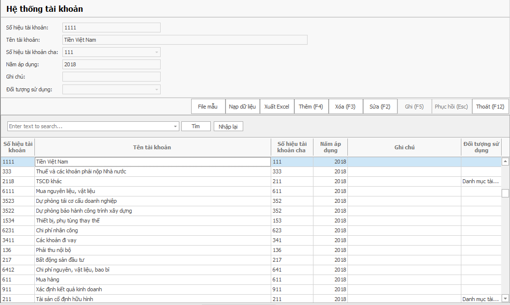 Mặc định phần mềm đã thiết lập sẵn hệ thống tài khoản chuẩn theo quy định hiện hành của Bộ Tài chính; người dùng có thể tùy chỉnh, thiết lập thêm thông tin tài khoản sử dụng phù hợp cho nhu cầu riêng của đơn vị.