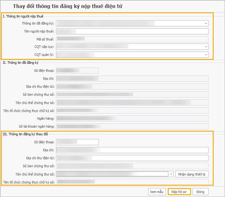 - Nhấn chọn Nộp hồ sơ để thực hiện ký và nộp tờ khai thay đổi thông tin.