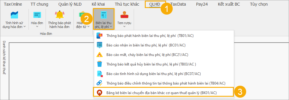 (3) Chọn Bảng kê biên lai chuyển địa bàn khác cơ quan thuế quản lý (BK01/AC)