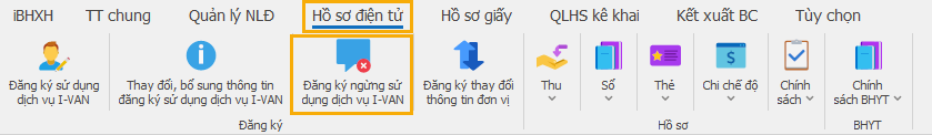 - Trong phần mềm iBHXH, trên thanh trình đơn chọn Hồ sơ điện tử, chọn mục Đăng ký ngừng sử dụng dịch vụ I-VAN
