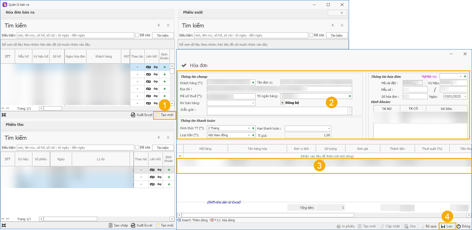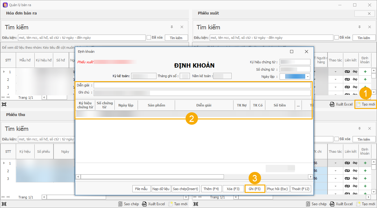 - Bước 3: Tại bảng Quản lý bán ra, Phiếu xuất, chọn Tạo mới, nhập chi tiết thông tin phiếu xuất (người nhận, mã số thuế, địa chỉ, phương thức xuất, lý do xuất,...) > nhập thông tin hàng hóa xuất kho (mã hàng hóa, tên hàng hóa, số lượng,...) & Ghi (F5)