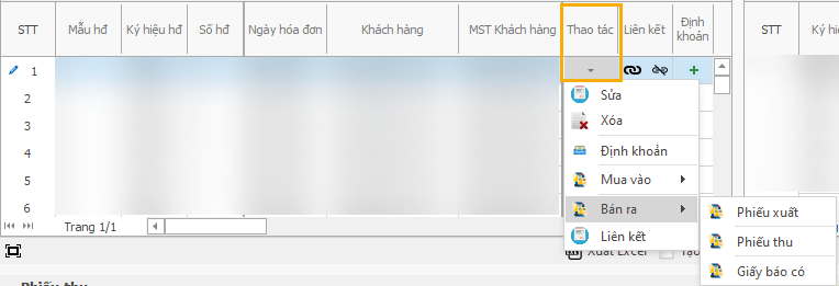 Người dùng tùy chọn Thao tác > Sửa, In, Định khoản,.. theo nhu cầu sử dụng hoặc chuyển đến các chứng từ liên kết: Hóa đơn bán ra, Phiếu thu, Giấy báo có.