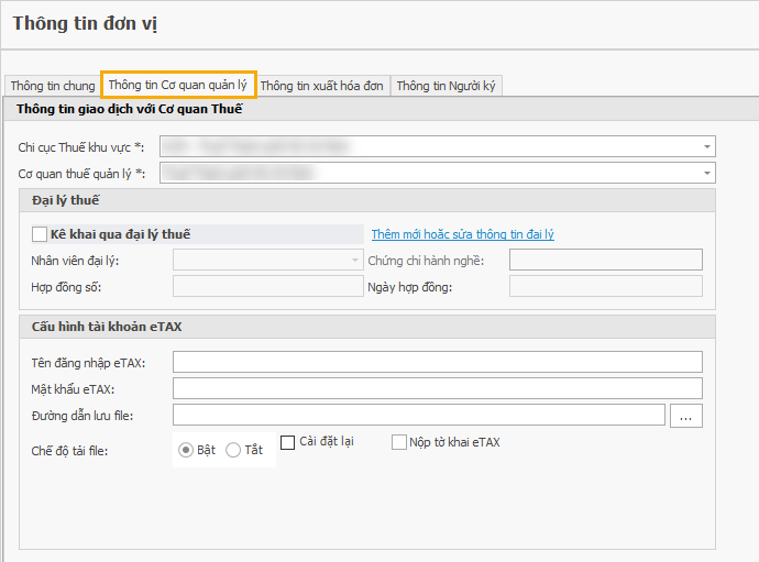 Thông tin giao dịch với Cơ quan Thuế: hỗ trợ thiết lập thông tin cơ quan Thuế quản lý của đơn vị;
