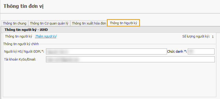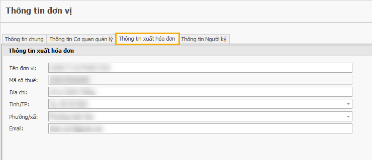 Thể hiện thông tin xuất hóa đơn của đơn vị; dữ liệu này tự động đồng bộ với hệ thống thông tin khách hàng của TS24; trường hợp đơn vị cần thay đổi thông tin xuất hóa đơn khi mua mới / gia hạn dịch vụ sử dụng cho TS24, có thể cập nhật lại nội dung tại bảng này.
