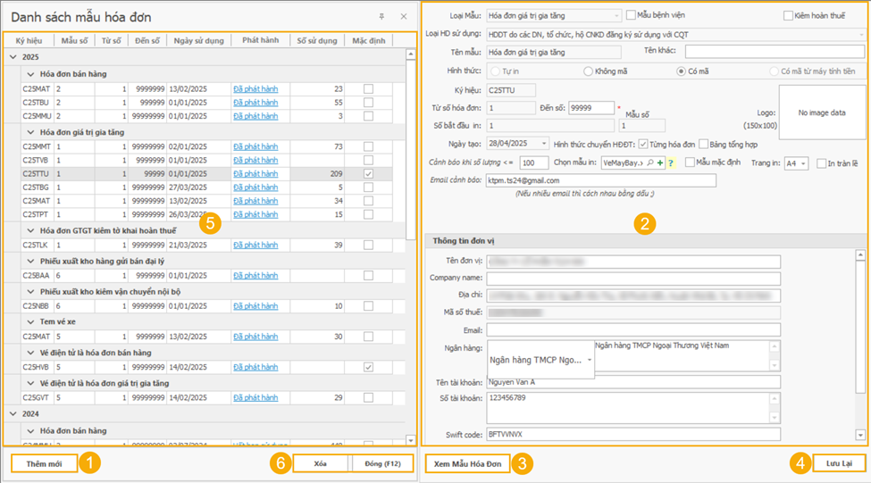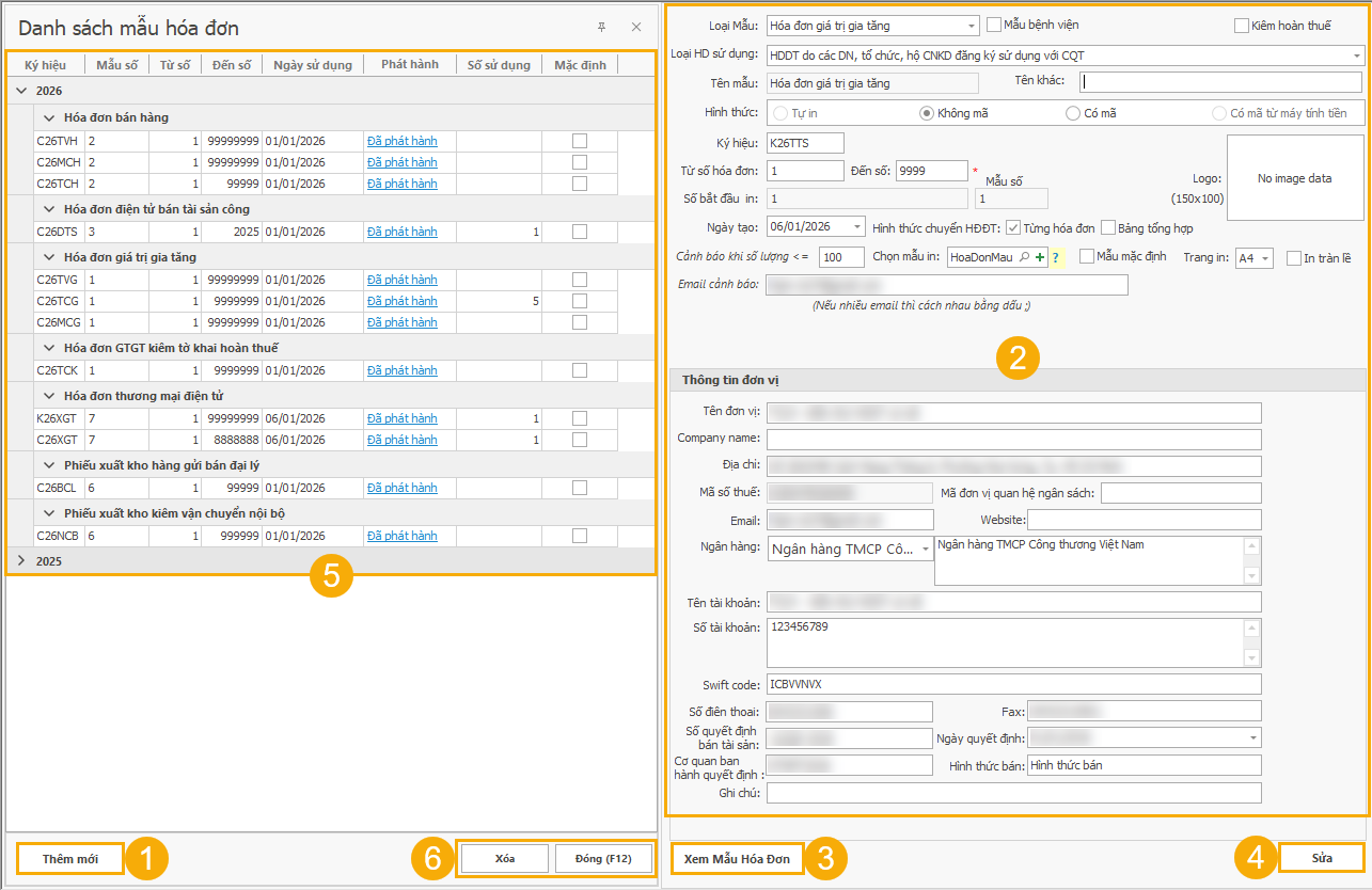 (6) Nút Xoá, Đóng (F12): nút chức năng hỗ trợ xoá thông tin mẫu hoá đơn hoặc đóng cửa sổ sử dụng.
