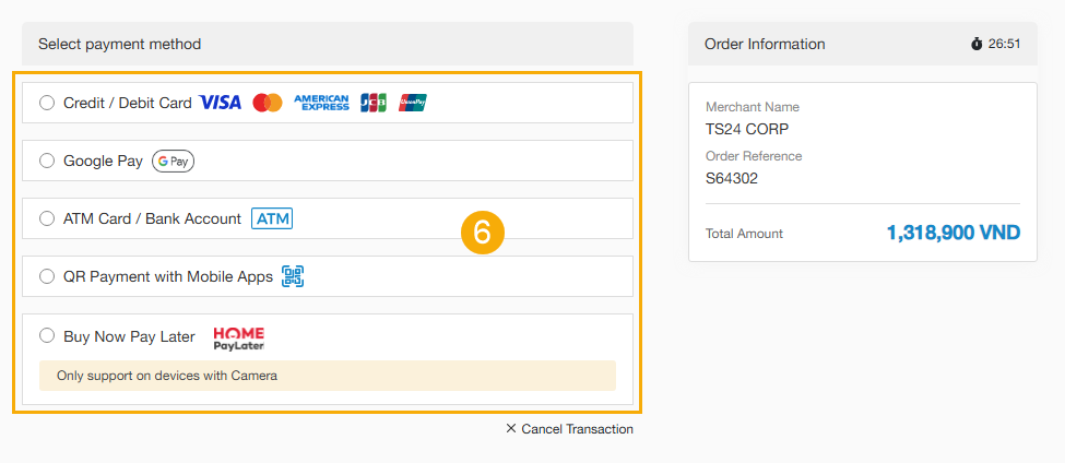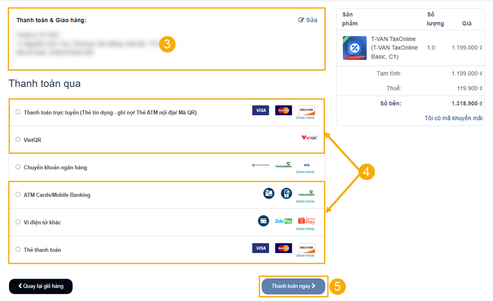 - Thanh toán trực tuyến: Bao gồm thanh toán bằng thẻ tín dụng (Visa, Mastercard, Discover) hoặc thẻ ATM nội địa/Mã QR.