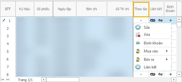 Người dùng tùy chọn Thao tác > Sửa, Xóa, In, Định khoản,.. theo nhu cầu sử dụng.