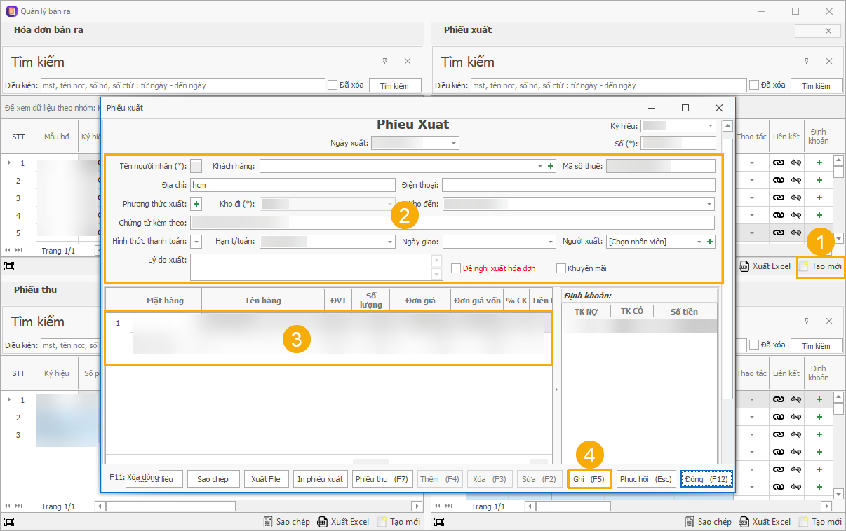 - Bước 3: Tại bảng Quản lý bán ra, chọn Phiếu xuất, chọn Tạo mới, nhập chi tiết thông tin phiếu xuất (người nhận, mã số thuế, địa chỉ, phương thức xuất, lý do xuất,...), chọn kho hàng xuất đi - kho đến (nếu có) > nhập thông tin hàng hóa xuất kho (mã hàng hóa, tên hàng hóa, số lượng,...) & Ghi (F5).