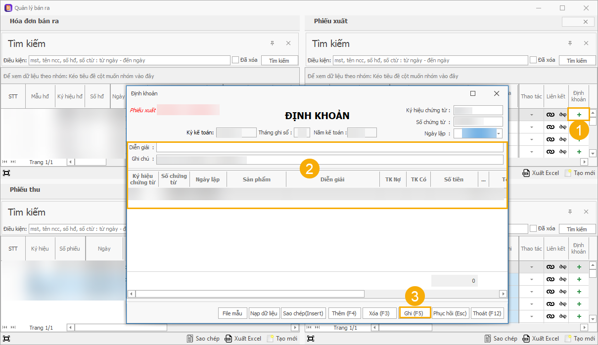 - Bước 4: Tại bảng Định khoản chứng từ: nhấn chọn Định khoản, nhập thông tin và hạch toán nghiệp vụ tương ứng & Ghi (F5).
