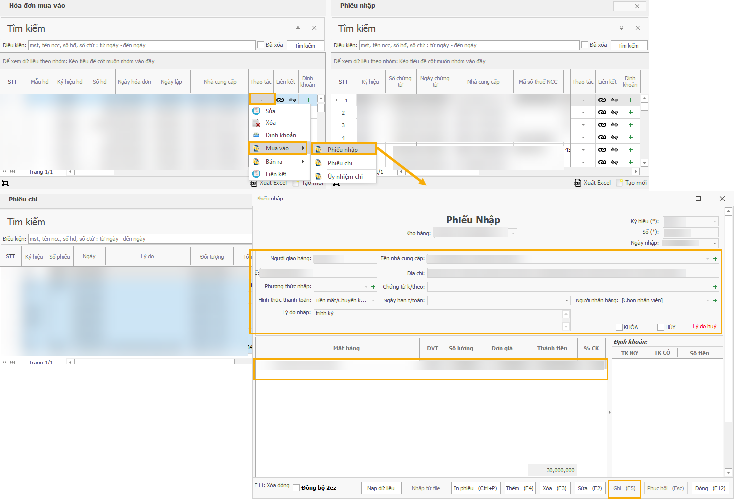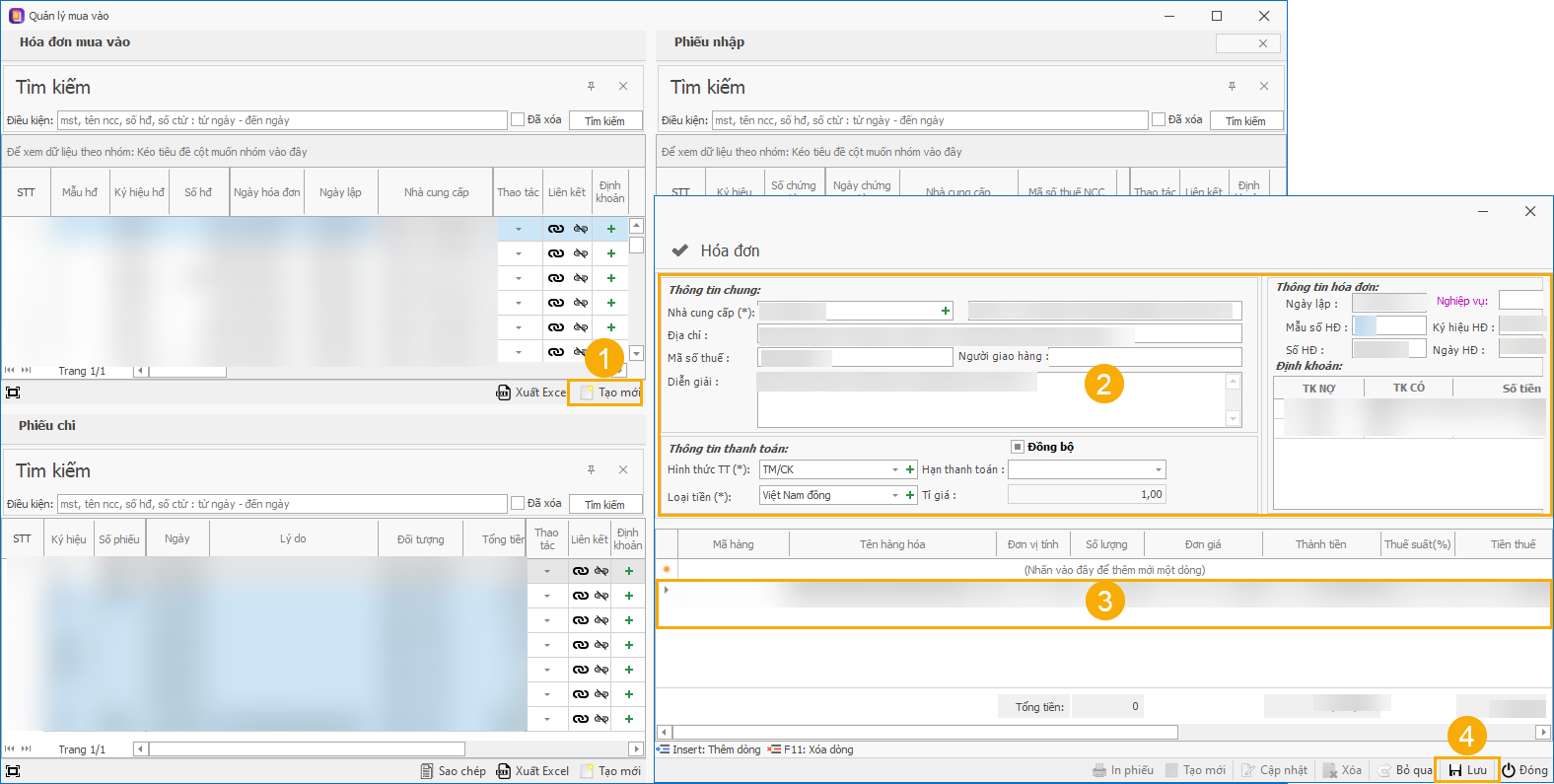 - Bước 3: Tại bảng Quản lý mua vào, mục Phiếu nhập, chọn Tạo mới, nhập chi tiết thông tin phiếu nhập (người giao, nhà cung cấp, mã số thuế, địa chỉ, phương thức nhập, lý do nhập, hình thức thanh toán,...) > nhập thông tin hàng hóa nhập kho (mã hàng hóa, tên hàng hóa, số lượng,...) & Ghi (F5).