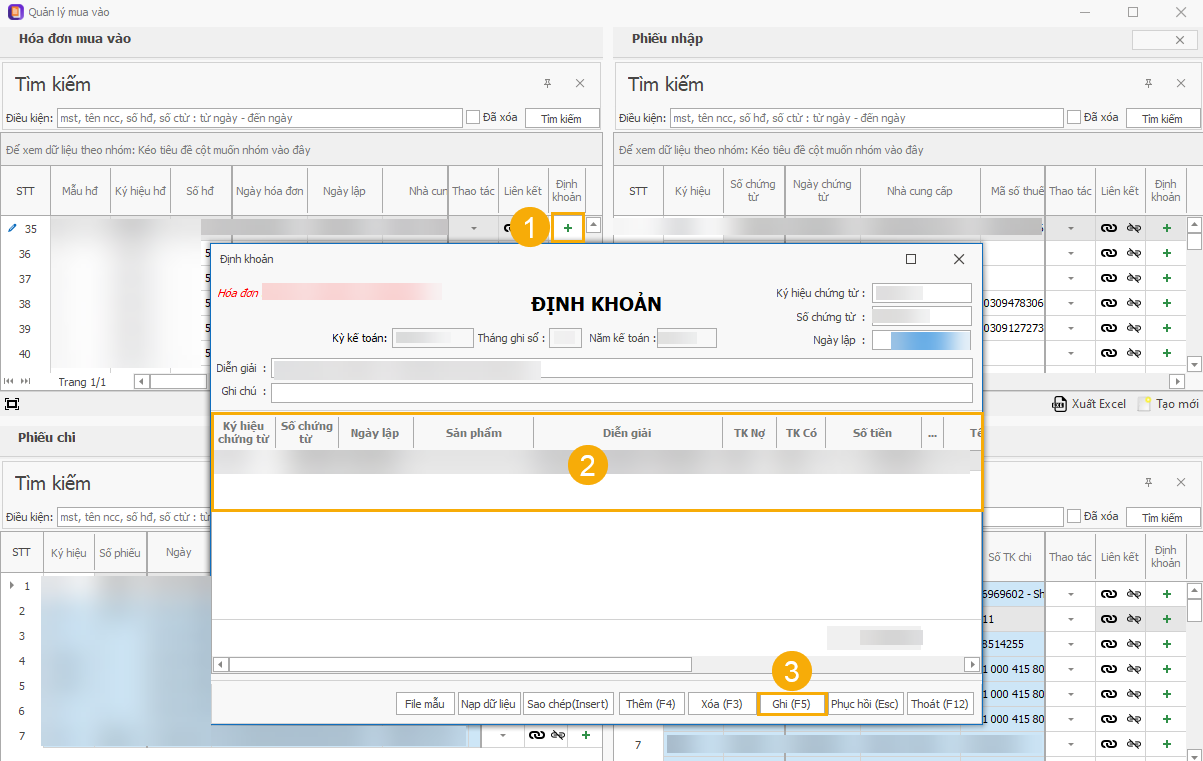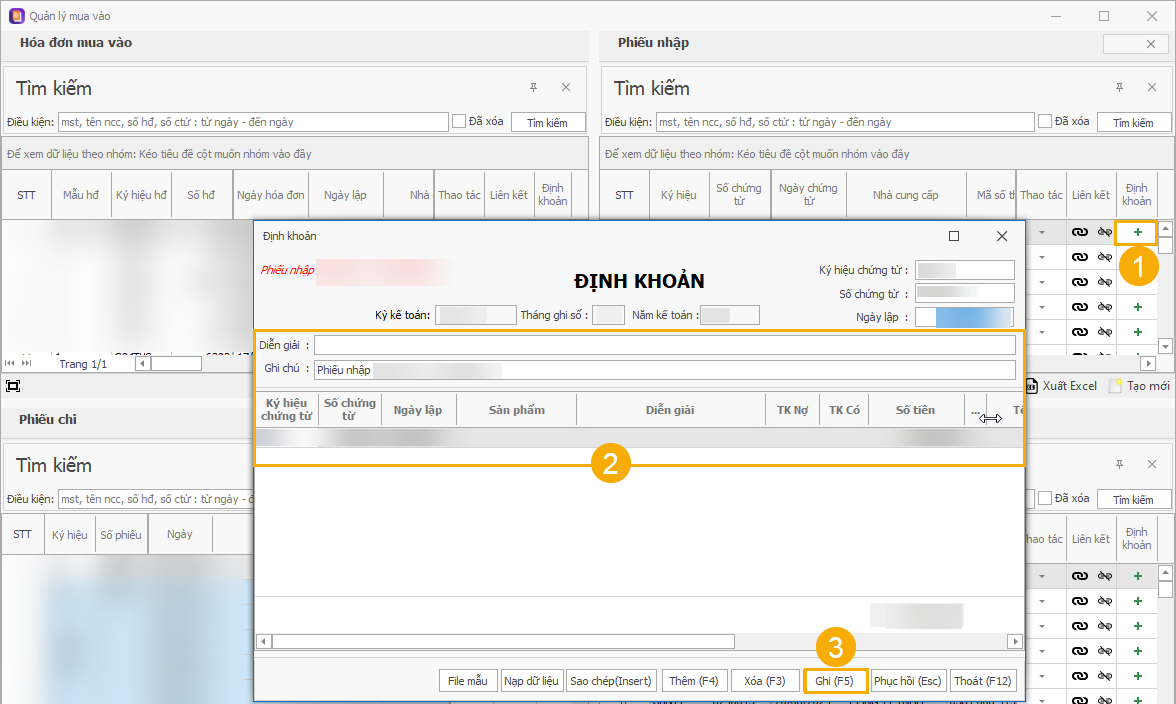- Bước 4: Định khoản chứng từ, nhấn chọn Định khoản, nhập thông tin và hạch toán nghiệp vụ tương ứng & Ghi (F5).