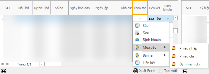 Người dùng tùy chọn Thao tác > Sửa, In, Định khoản,.. theo nhu cầu sử dụng hoặc chuyển đến các chứng từ liên kết: Hóa đơn mua vào, Phiếu chi, Ủy nhiệm chi.
