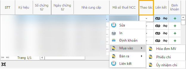 Người dùng tùy chọn Thao tác > Sửa, In, Định khoản,.. theo nhu cầu sử dụng hoặc chuyển đến các chứng từ liên kết: Hóa đơn mua vào, Phiếu chi, Ủy nhiệm chi.