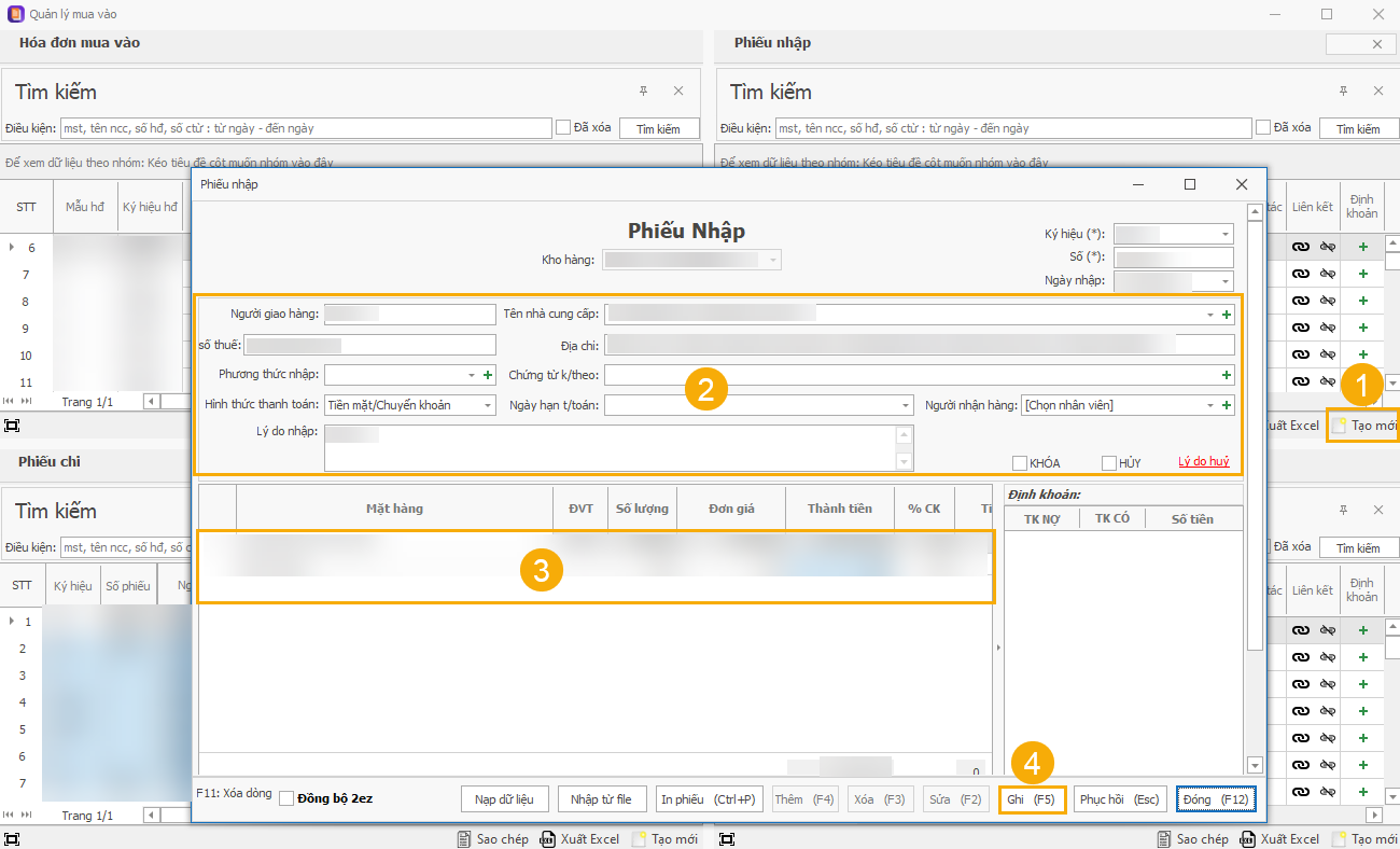 - Bước 3: Bảng Quản lý mua vào: mục Phiếu nhập, chọn Tạo mới, nhập chi tiết thông tin phiếu nhập (người giao, nhà cung cấp, mã số thuế, địa chỉ, phương thức nhập, lý do nhập, hình thức thanh toán,...) > nhập thông tin hàng hóa nhập kho (mã hàng hóa, tên hàng hóa, số lượng,...) & Ghi (F5).