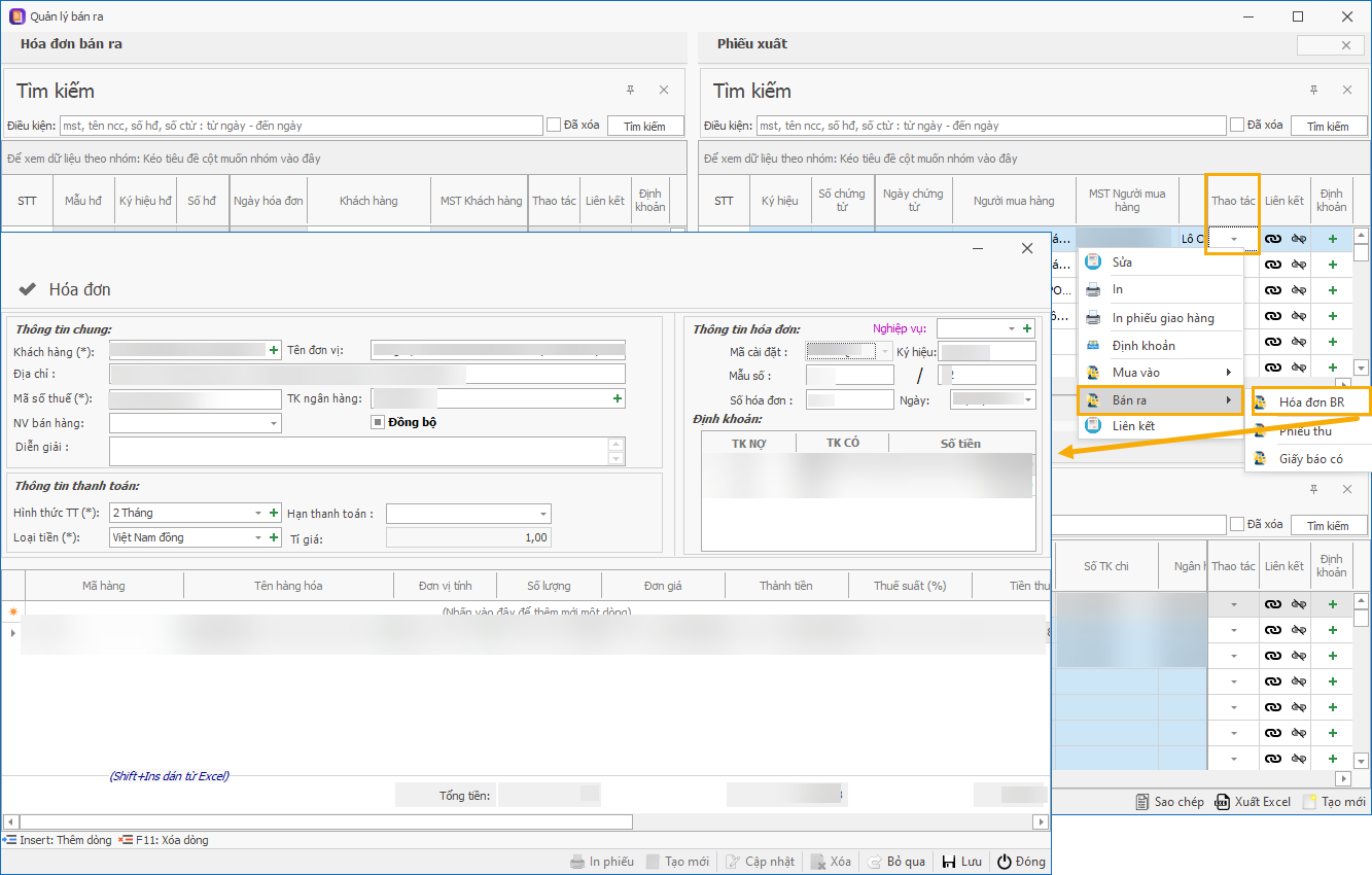 Người dùng tùy chọn Thao tác > Sửa, In, Định khoản,.. theo nhu cầu sử dụng hoặc chuyển đến các chứng từ liên kết: Hóa đơn bán ra, Phiếu thu, Giấy báo có.