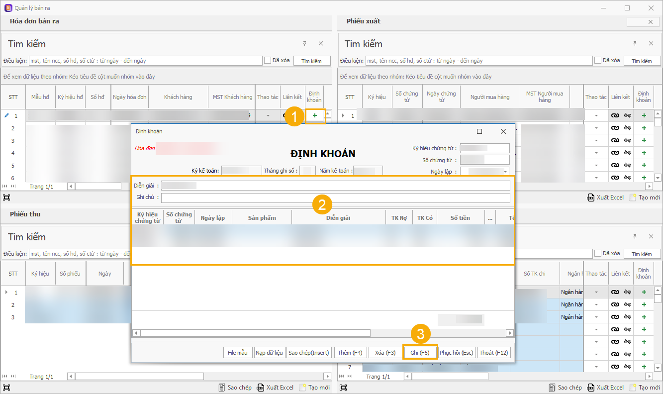 Định khoản chứng từ: nhấn chọn Định khoản > nhập thông tin và hạch toán nghiệp vụ tương ứng > Ghi (F5)