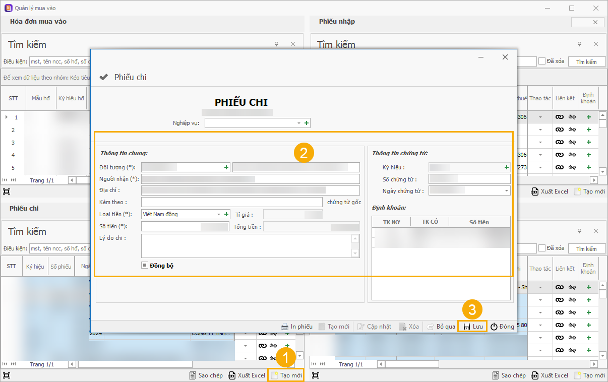 - Bước 3: Chọn Bảng Quản lý mua vào, mục Phiếu chi, chọn Tạo mới. Nhập chi tiết thông tin phiếu chi (số chứng từ, đối tượng, người nhận, lý do chi, số tiền,...) & Lưu.