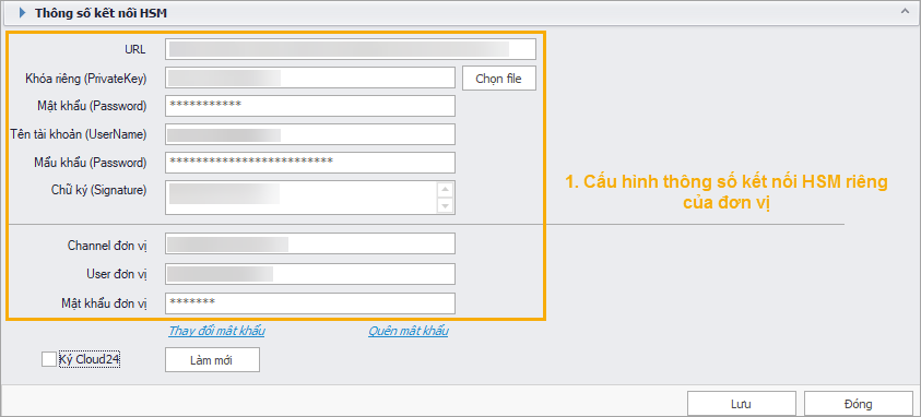 Hỗ trợ cấu hình kết nối chữ ký số HSM sử dụng riêng của đơn vị;