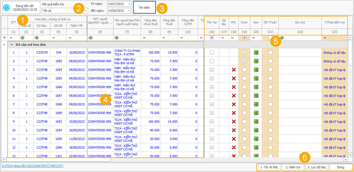 . cột Chọn: hỗ trợ tuỳ chọn thông tin hoá đơn để thực hiện tải về XML, Kiểm tra, Lưu dữ liệu