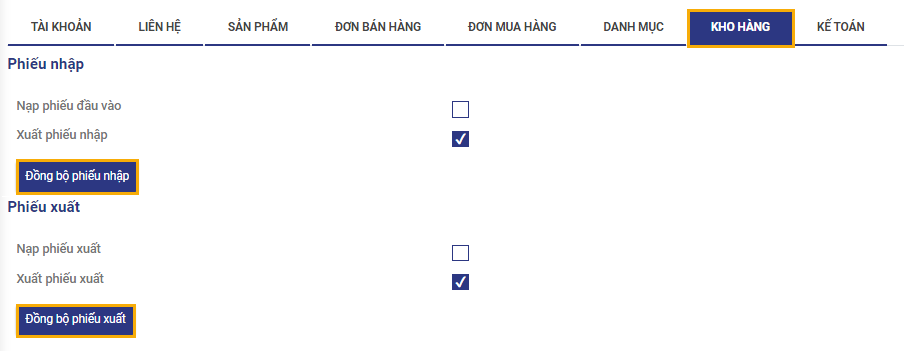 - Kho hàng: Hỗ trợ đồng bộ dữ liệu phiếu nhập kho phiếu xuất kho