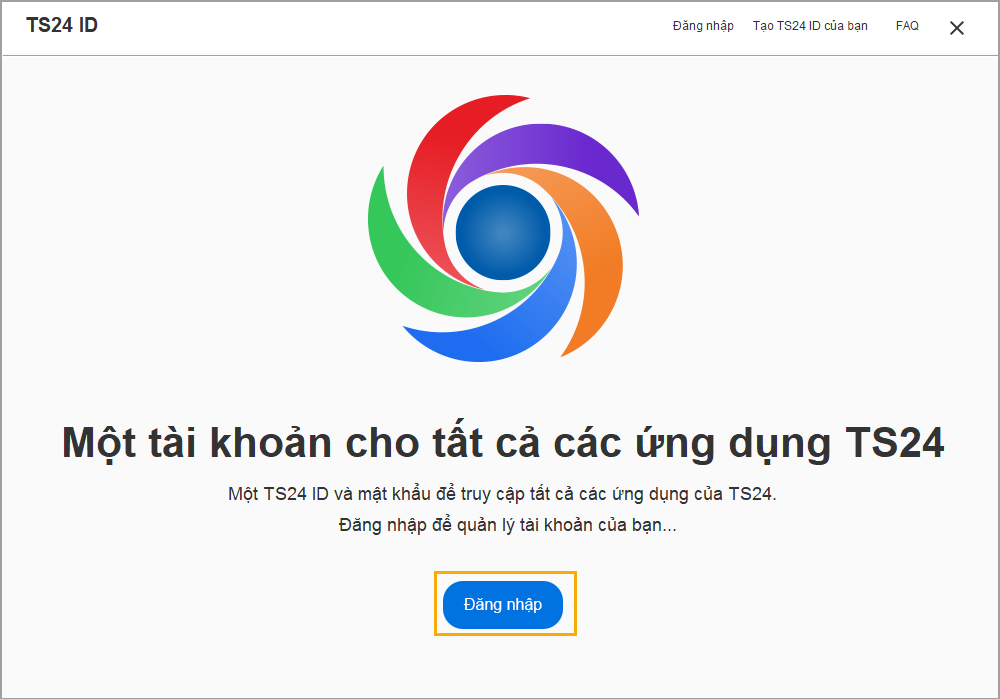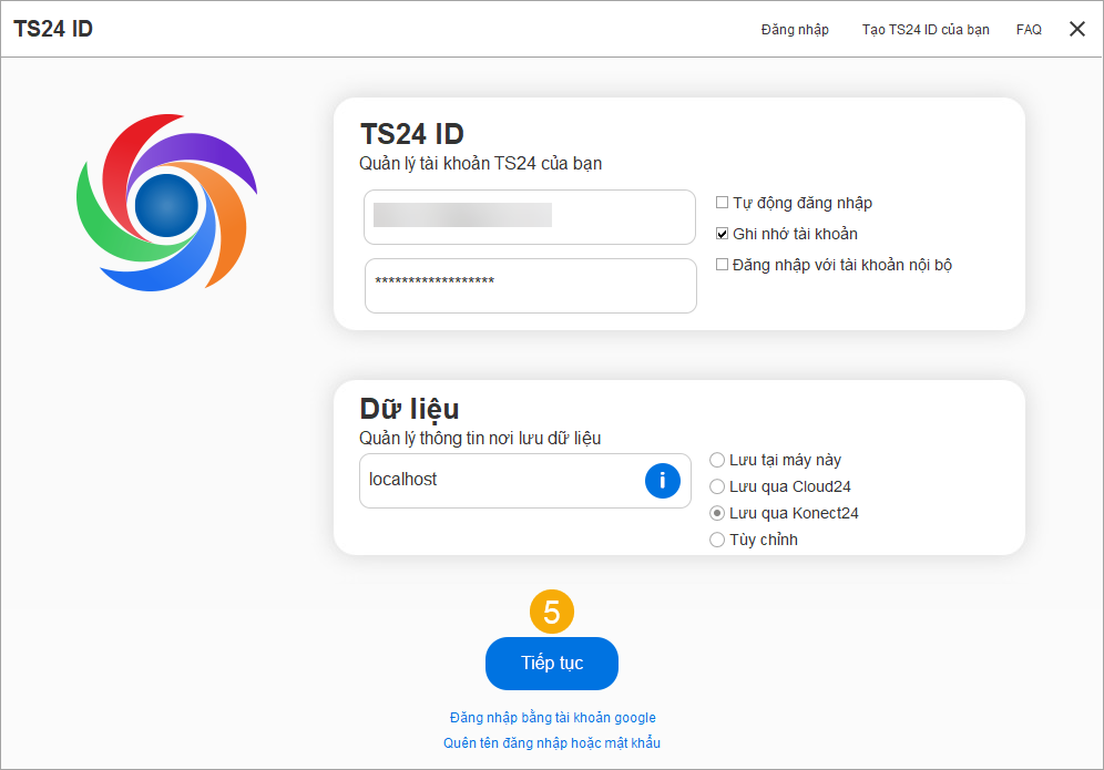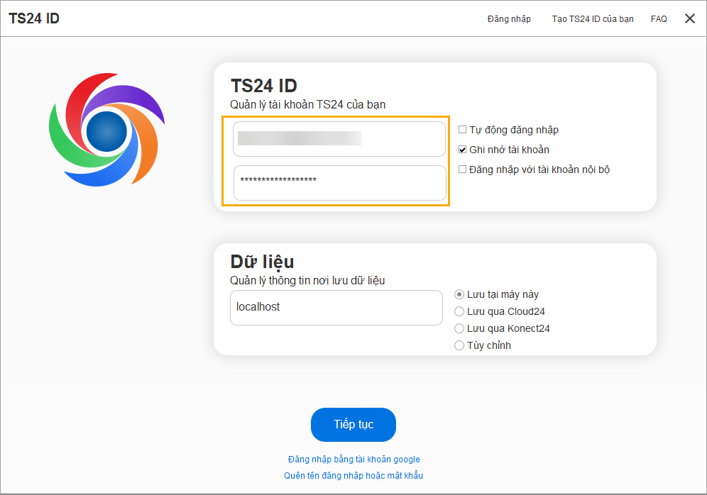 Nhập vào tên đăng nhập và mật khẩu tài khoản TS24 ID người dùng đã đăng ký.