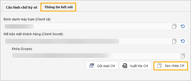 Cách 2: Tại tab Thông tin kết nối, nhấp chọn nút Sao chép CH để sao chép toàn bộ thông số kết nối, lưu lại thông tin này (vào Notepad, Word…) để thuận tiện cho việc tạo cấu hình kết nối với iBHXH.
