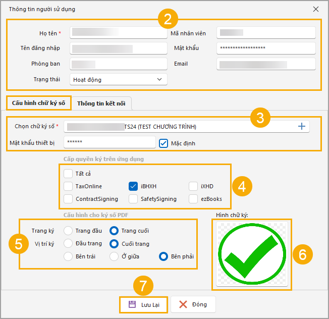 (5) Cấu hình cho ký số PDF: Tùy chọn Trang ký, Vị trí ký.