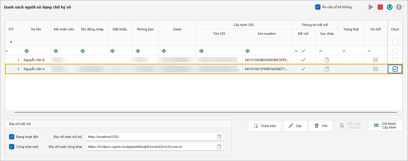 (8) Hiển thị danh sách người sử dụng và chữ ký số tương ứng cho từng ứng dụng. Chọn vào dòng chữ ký số để chỉnh sửa hoặc xóa chữ ký số.