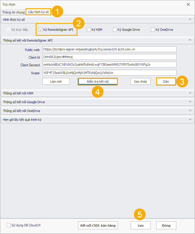 (3) Nhấn Dán để dán thông tin kết nối RemoteSigner API