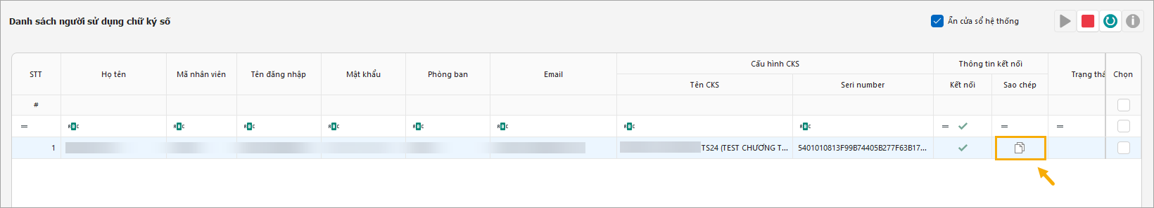 Cách 1: Tại giao diện Danh sách người sử dụng chữ ký số, nhấp chuột vào ô Sao chép (*) tại cột Thông tin kết nối để sao chép toàn bộ thông số kết nối, lưu lại thông tin này (vào Notepad, Word…) để thuận tiện cho việc tạo cấu hình kết nối với Kyso.
