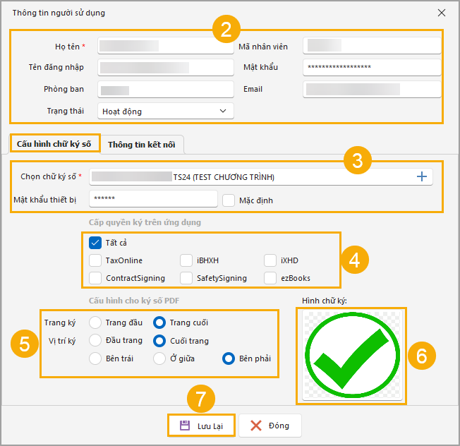 (5) Cấu hình cho ký số PDF: Tùy chọn Trang ký, Vị trí ký.