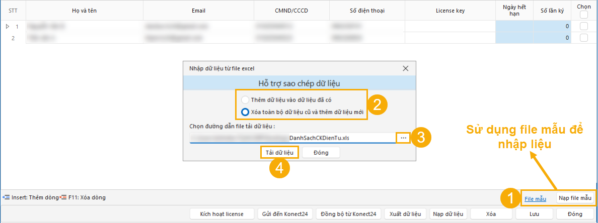 (2) Tùy chọn Thêm dữ liệu vào dữ liệu đã có hoặc Xóa toàn bộ dữ liệu cũ và thêm dữ liệu mới.