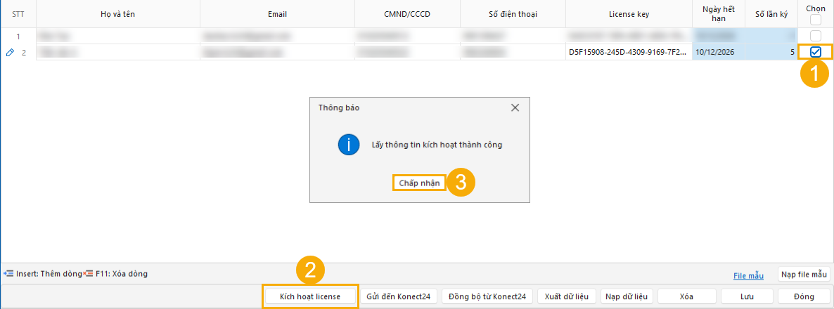 - Cách 1: Nhập trực tiếp vào phần mềm ở các trường họ và tên, email, CMND/CCCD, số điện thoại, license key.