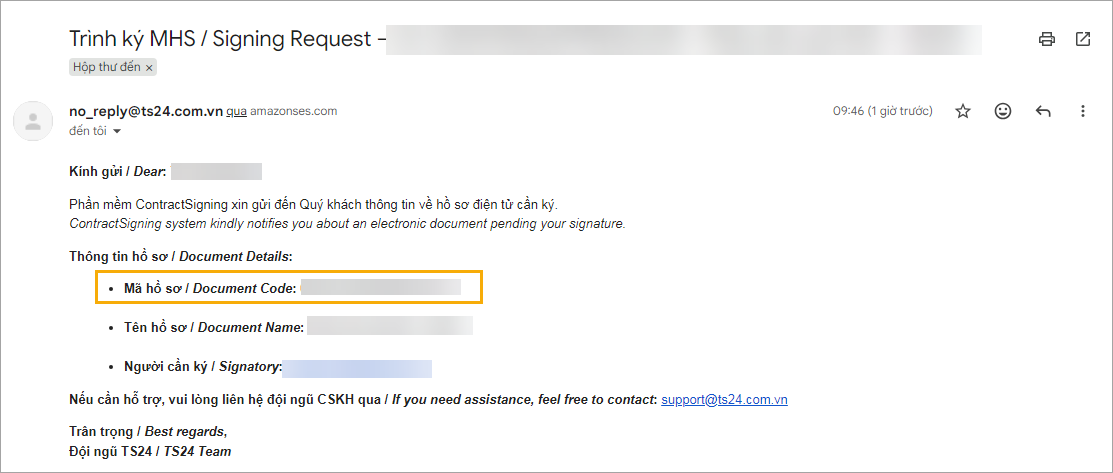 Khi ContractSigning trình ký hồ sơ, thì người ký sẽ nhận được mail thông báo sau: