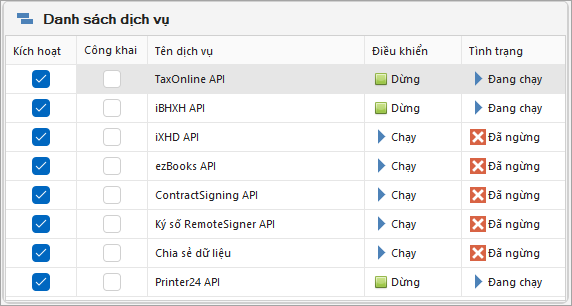 Cột Điều khiển: Cho Dừng hoặc Chạy ứng dịch vụ được Kích hoạt trước đó.