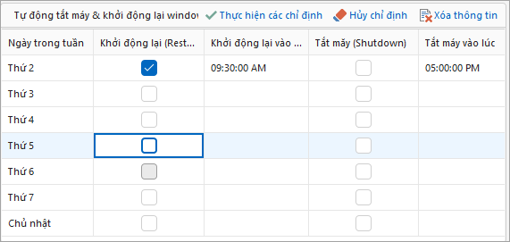 Cột Khởi động lại (Restart): Tích chọn hoặc bỏ chọn các thứ trong tuần để khởi động lại windows.