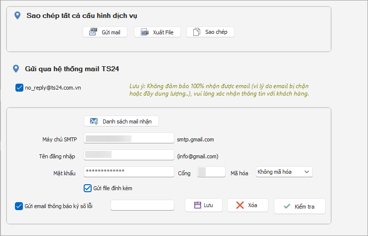 Gửi qua hệ thống mail TS24: nếu tích chọn thì email gửi từ hệ thống mail của Công ty TS24. Nếu không tích chọn thì phải cấu hình email người gửi ở phần thông tin bên dưới