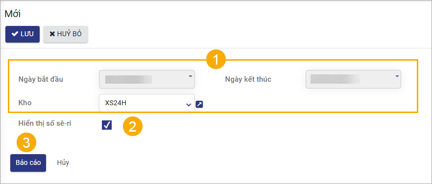 (1) Chọn Ngày bắt đầu, Ngày kết thúc, Kho