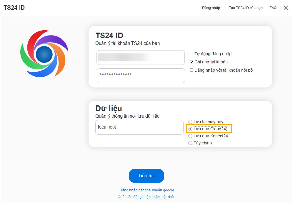 Khi đăng nhập TS24 ID, chọn Lưu qua Cloud 24 để đăng nhập và kết nối với dữ liệu trên Cloud.