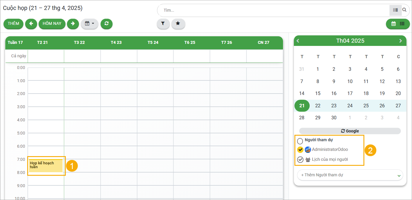 (1) Cuộc họp được hiển thị tại ô tương ứng với ngày và khung giờ đã chọn.