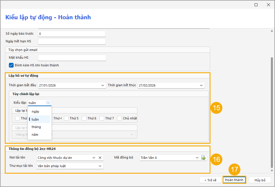 - Tuỳ chỉnh lặp lại: Chọn Kiểu lặp: Ngày hoặc tuần hoặc tháng hoặc năm.