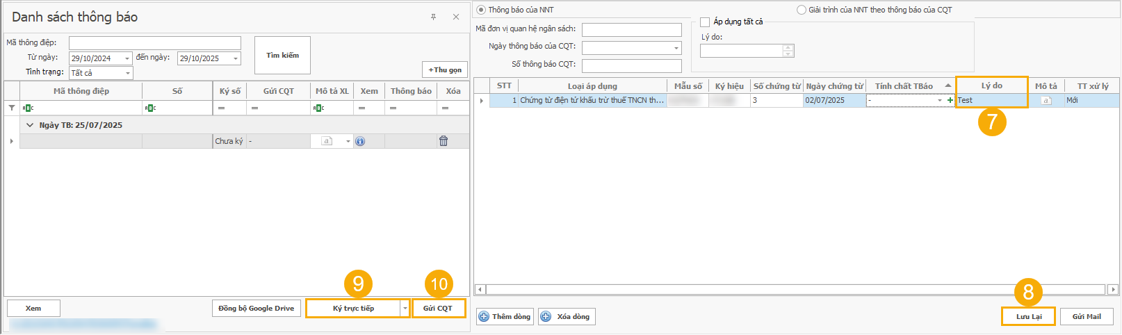 (9) Tại bảng Danh sách thông báo, người dùng lựa chọn dòng thông báo mình vừa lưu, sau đó nhấn Ký trực tiếp, chọn CKS để ký.