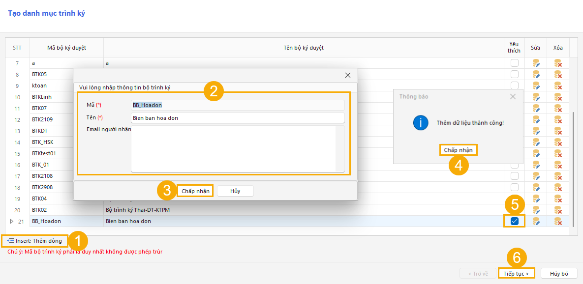 Các thao tác còn lại hoàn toàn giống với bài viết Danh mục trình ký.